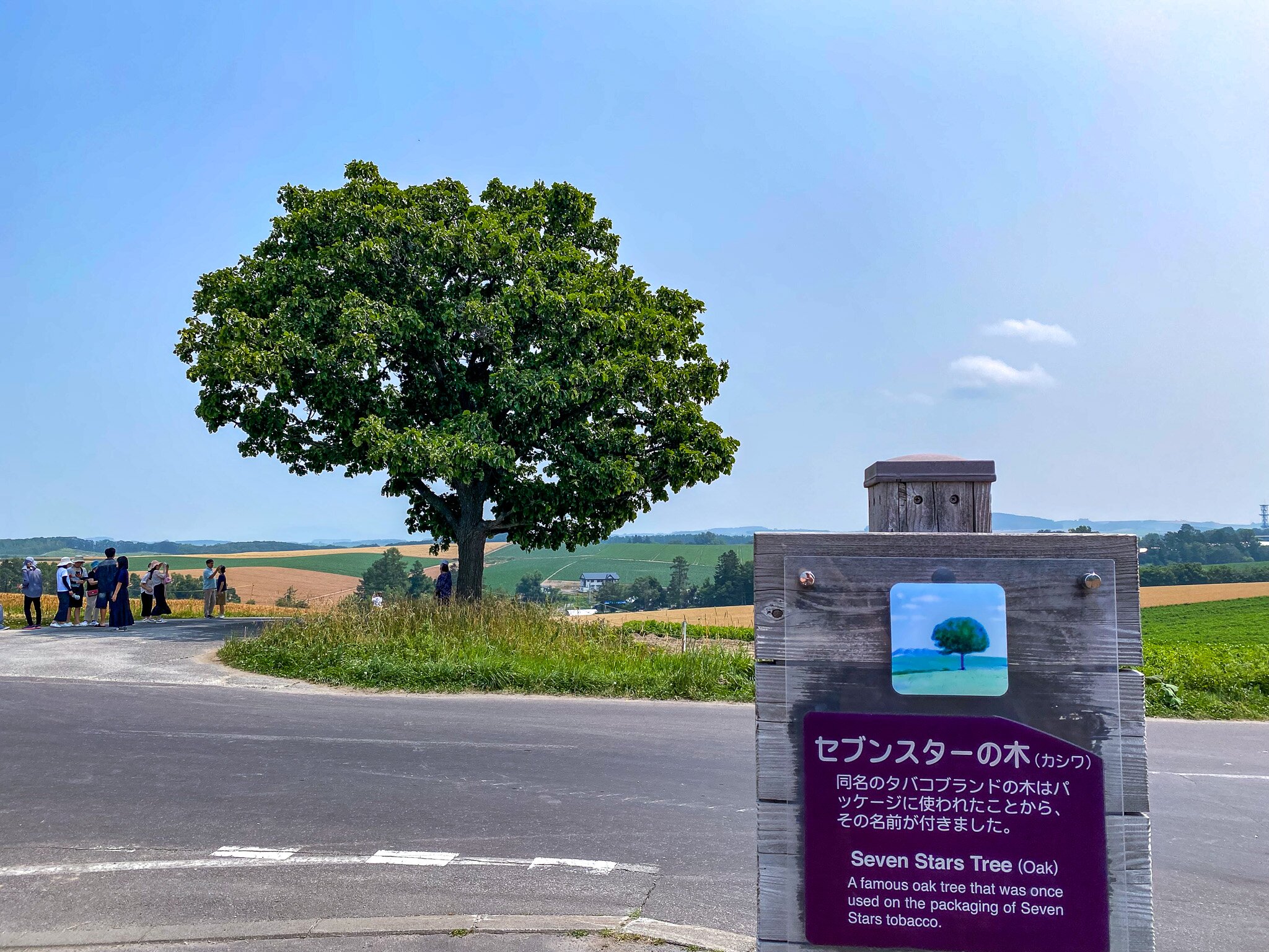 The Seven Stars Tree is located in Hokuei, Biei, Kamikawa District. As it is part of a rural scenic route, public transportation options are limited. Most visitors reach the tree by car, often as part of a self-driving tour of Biei's hills. Reviewers mention driving for an hour and a half to reach the area, highlighting the need for personal transport. The tree is situated next to the road, making it easily accessible for a quick stop. Parking is typically available nearby, though it might be informal roadside parking.