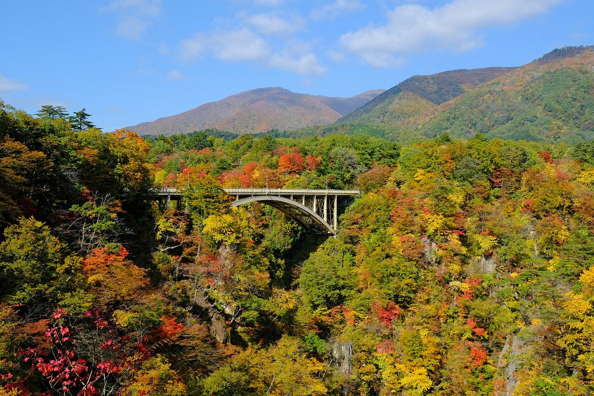 Naruko Valley, or Naruko Gorge (鳴子峽), is a magnificent natural wonder in Miyagi Prefecture, Japan, celebrated for its dramatic V-shaped gorge carved by the Ōya River. It is particularly famous for its stunning autumn colors, which transform the landscape into a vibrant tapestry of reds, oranges, and yellows. The valley's beauty is enhanced by the deep ravine, streams, and waterfalls, making it a significant destination for nature lovers and photographers.
