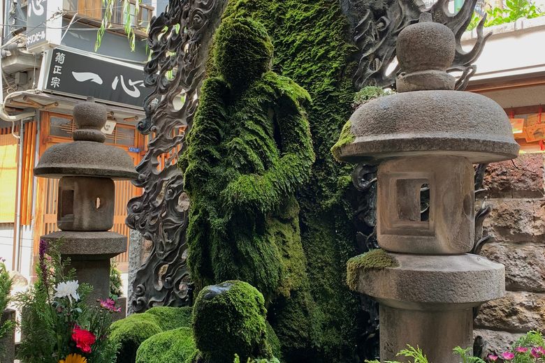 The Fudo Myo-o Statue, located within the small Hozenji Temple, is a significant cultural and spiritual landmark in Osaka. Built in 1637, the temple and its statue are notable for being one of the few historic structures in the area to have survived the bombings of World War II. The statue itself, dedicated to Fudo Myo-o, one of the five Wisdom Kings in Japanese Buddhism, is particularly striking due to its thick, lush green moss covering, a result of centuries of ritualistic water splashing.