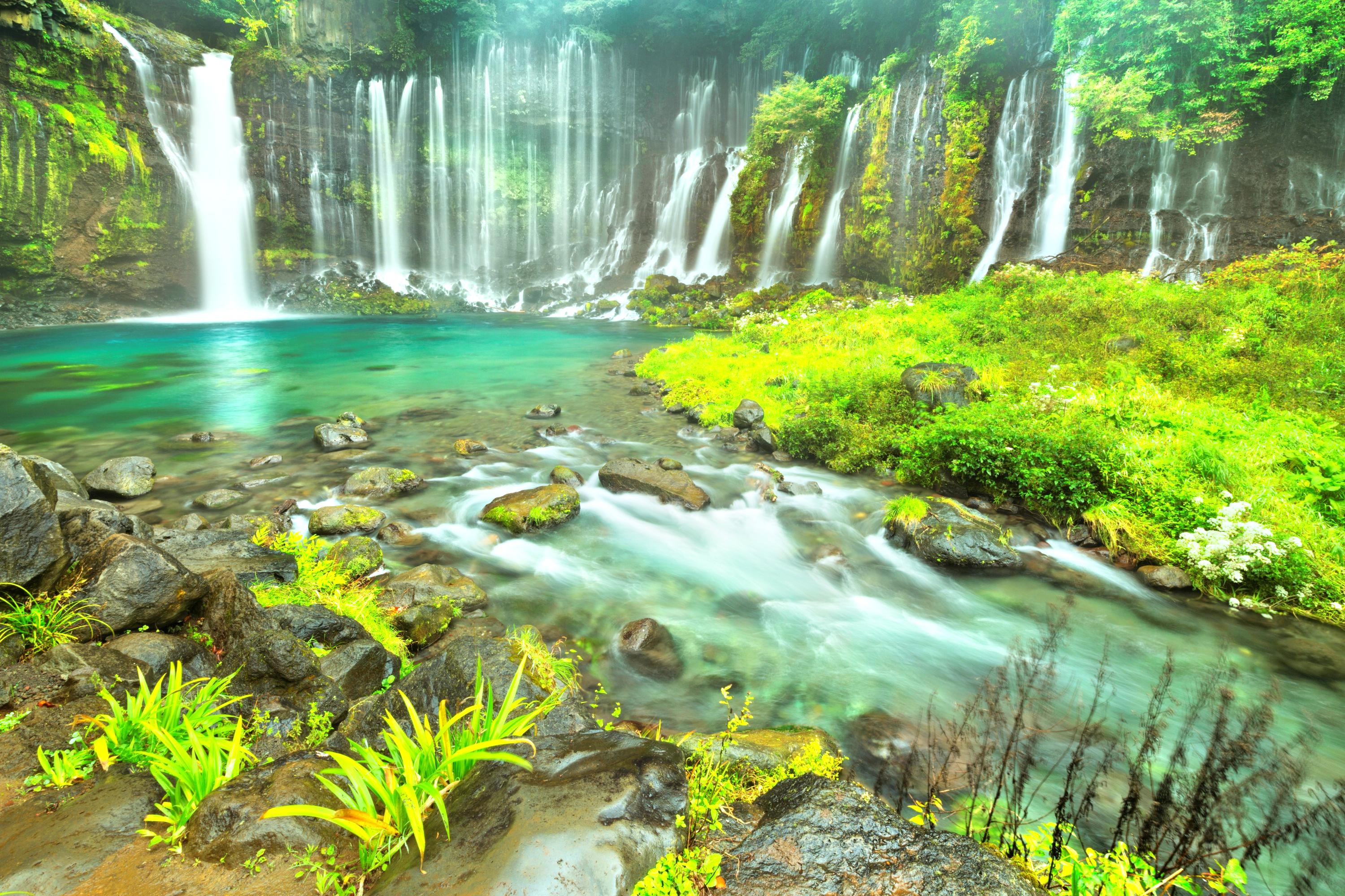 Shiraito Falls, meaning 'White Thread Falls,' is a designated National Natural Monument and one of Japan's most famous waterfalls, drawing its water directly from the melted snow and ice of Mount Fuji. Unlike typical waterfalls formed by rivers, Shiraito's water seeps through volcanic rock, creating a unique, wide curtain of delicate cascades. This natural wonder is deeply intertwined with the spiritual significance of Mount Fuji, having been protected for centuries.